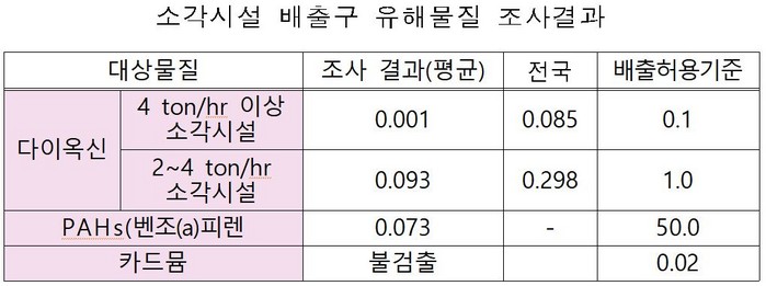 유해물질 배출원 조사결과, 소각시설에서 배출되는 다이옥신 등 오염물질은 배출허용기준 대비 낮은 수준으로 나타났다. 다이옥신(0.001~0.093ng I-TEQ/Sm3)과 다환방향족탄화수소류(PAHs) 중 벤조(a)피렌(0.073㎍/Sm3)이 배출허용기준 대비 0.15~9.3% 수준으로 확인됐고, 카드뮴은 불검출됐다고 공개했다.