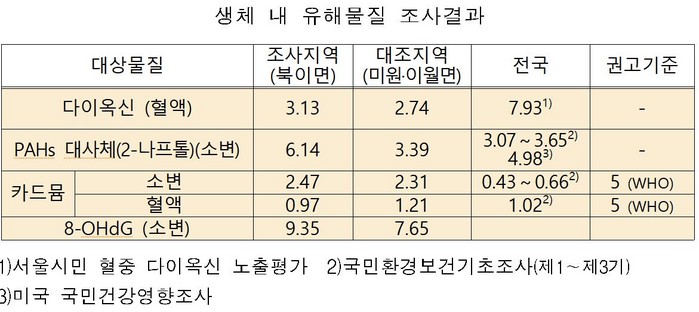 주민들의 생체 내 유해물질 조사결과, 혈액 중 다이옥신 농도(3.13 pg WHO-TEQ/g-lipid)는 타지역인 서울(7.93pg) 대비 39.5%로 낮은 수준을 보였으나, 일부 항목(카드뮴, 다환방향족탄화수소류 대사체, 유전자 손상지표 8-OHdG 등)이 일반 국민 및 대조지역에 비해 높았다. 'pg WHO-TEQ/g-lipid'는 '피코그램 더블유에이치오 티이큐 퍼 그램리피드'로 읽고, 단위 그램 지질(g-lipid) 당 10-12g의 WHO 기준 독성등가 환산농도(TEQ)다.