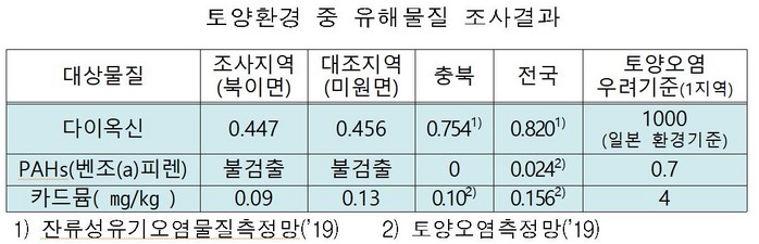 토양에서 검출된 다이옥신 평균 농도(0.447pgI-TEQ/g)는 충북·전국보다 낮았고, 카드뮴(0.09mg)도 전국 평균(0.156mg)과 토양오염우려기준(4mg) 보다는 낮은 수준이었다.
