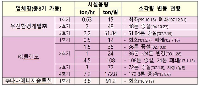 이후, 신증축을 통해, 2017년 기준으로 3개 업체의 총 소각용량이 1999년에 비해 약 36배(1999년 15톤/일 → 2017년 543.84톤/일) 늘렸다.