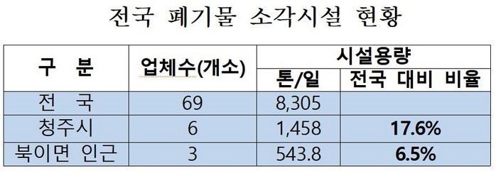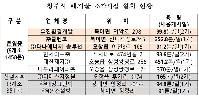 청주시 북이면 일원의 소각시설은 우진환경개발㈜이 1999년에 하루 15톤 처리할 수 있는 소각시설을 가동한 이후,㈜클렌코(옛 진주산업, 2001년, 12톤)와 ㈜다나에너지솔루션(2010년, 91.2톤)이 가동을 개시했다.