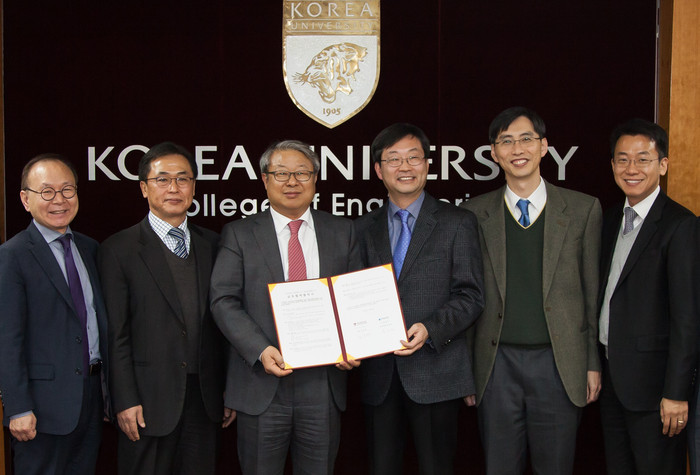 | ▲한국철강협회와 고려대는 12월 8일 서울 성북구 고려대 공학관에서 전문 석(박)사 인증과정 신설 및 업계 재직자 재교육 목표로 철강산업 맞춤형 인적자원개발 협력 위한 양해각서를 체결했다. 사진 좌로부터 세 번째가 한국철강협회 송재빈 부회장, 네 번째 고려대 정진택 공과대학장) |