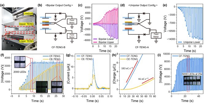 손바닥보다 조금 큰 10×10cm² 대면적 소자 실험에서는 양극성 모드에서 약 ±6kV, 단극성 모드에서 –14kV 전압을 약 8초 안에 만들어냈다. 연구팀은 이 소자로 LED 5000개가 연결된 어레이를 25초 만에 모두 점등하는 데도 성공했다.
