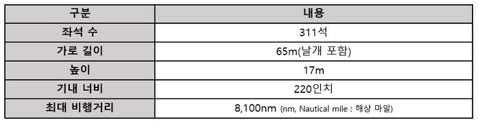 A350은 동체의 53%가 탄소 섬유 강화 플라스틱 소재의 최첨단 복합 소재(Composite)로 구성, 기체 무게가 대폭 감소돼 이를 통해 연료 소모량을 기존 항공기 대비 최대 25%까지 개선한 친환경 항공기다. 또한 기존 대형항공기 대비 기내 습도가 5% 향상됐으며 기내 소음도 4~6데시벨(dB) 개선되었다.