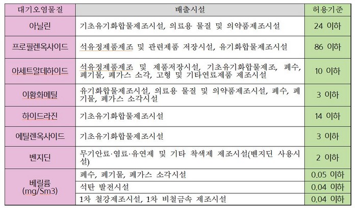 이번 신설되는 배출허용기준(ppm)은 국내 사업장의 배출실태, 해외사례 등을 고려해 설정했다. 8종 유해물질 기준치는 아세트알데하이드(10), 아닐린(24), 프로필렌옥사이드(86), 이황화메틸(3), 하이드라진(14), 에틸렌옥사이드(3), 벤지딘(2), 베릴륨(0.4~0.5mg/Sm3) 등이다.
