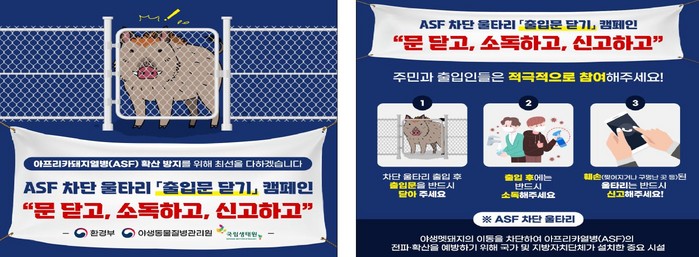 이 밖에도 환경부는 '아프리카돼지열병 차단 울타리 출입문 닫기'운동(문닫고, 소독하고, 신고하고)을 실시하며, 이번 여름철 기간 동안 집중적인 홍보를 통해 지역주민들과 함께 하는 차단방역 체계를 구축할 예정이다.