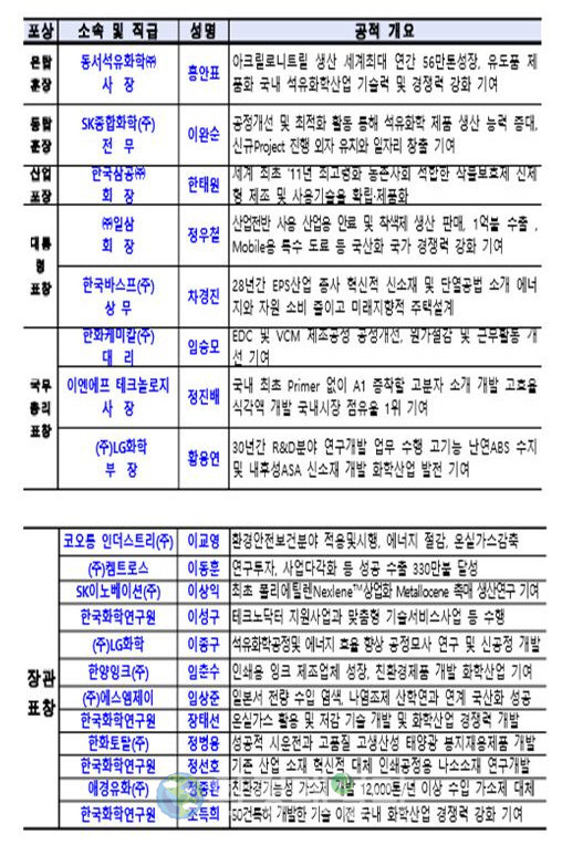 동탑산업훈장에는 SK종합화학 이완순 전무, 산업포장은 한국삼공 한태원 회장, 대통령 표창은 일삼 정우철 회장, 한국바스프 차경진 상무에게 각각 영예의 수상자로 선정됐다.