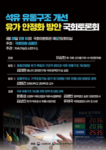 김종민 의원(세종시갑, 산자중기위)은 28일, ‘석유 유통구조 개선과 유가 안정화 방안 국회토론회’을 개최했다. 이날 발표에는 에너지경제연구원 김태환 석유정책연구실장, 강원대 김형건 교수가, 토론에는 김영빈 변호사, 산업부 석유산업과 윤종성 팀장, 한국석유공사 김상인 유통사업처장, 국회입법조사처 유재국 선임연구관이 참여했다.