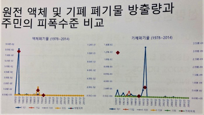 그는 "방출했는데 무엇인지 어떤 물질을 방출했는지 모를정도였다."고 했다. 그동안 조사한 결과(1978~2014)를 보면, 액체폐기물 및 기체폐기물 방출량은 방출 방사선량에 근거해 주민들이 피폭된 개인 최고선량, 그리고 인구누적선량을 계산하는데 있어, 그 근거가 불분명하며 연도에 따라 방출량이 더 많음에도 불구하고 더 늦게 사업자 측면에서만 계산돼왔다.