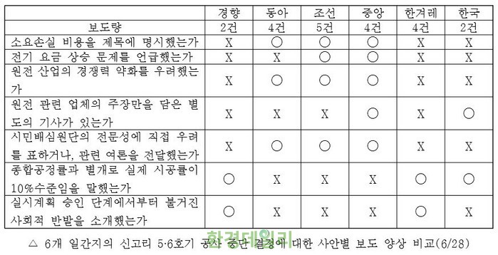 | ▲최근 중앙 주요 일간지들이 바라보는 원자력 발전 산업에 대한 보도 내용 |