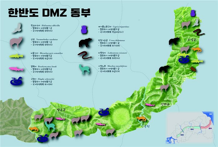 DMZ, De-militarized Zone에 산양, 사향노루, 반달가슴곰 등 멸종위기 야생생물 Ⅰ급을 비롯, 총 4873종의 야생 동식물이 서식하는 것으로 확인됐다.