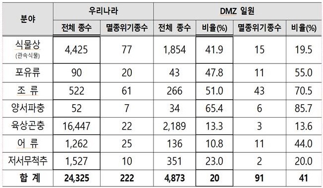 멸종위기 야생생물은 7개 분야의 222종(전체 246종)의 약 41%인 91종이 DMZ에 서식하는 것으로 확인됐다.