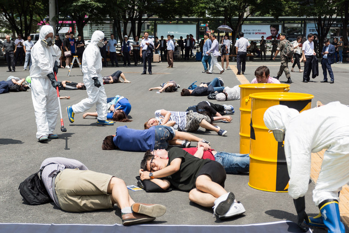 ▲올 7월 부산역 앞. 원전 사고가 발생한 상황을 가상으로 표현해 신고리 5,6호기 건설 허가 승인이 얼마나 무책임한 결정인지 보여주기 위해 그린피스가 시민들과 함께 진행한 퍼포먼스 |