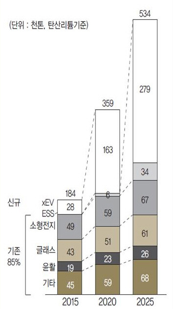 전지 혁신이 가속화되면서 자동차 기업들은 대규모 전기차 출시 계획을 발표하고 있다. 현재 리튬 수요 시장의 85%는 모바일전지, 유리, 윤활유 등 기존 시장의 수요이며 전기차용 수요는 15% 이하다.