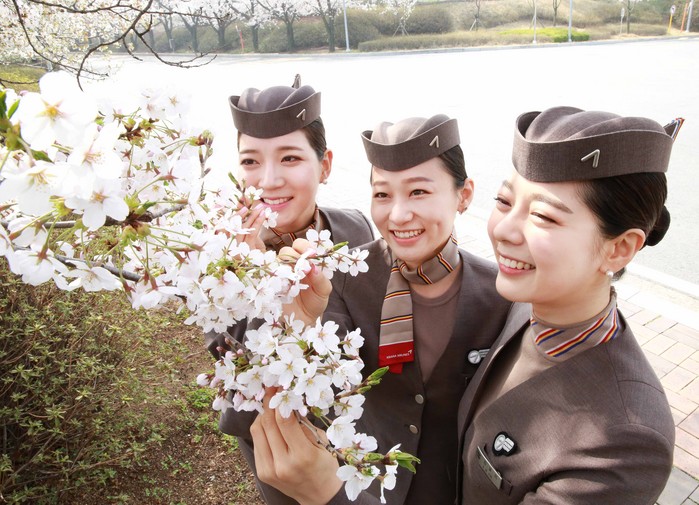 아시아나항공 본사 출입구에 만개한 벚꽃 길을 따라 아시아나항공 캐빈승무원들이 출근하고 있다. 아시아나항공은 1998년 4월 현위치로 사옥을 이전하며 곳곳에 벚꽃나무를 심기 시작 2016년 현재까지 총 430그루를 심었다.