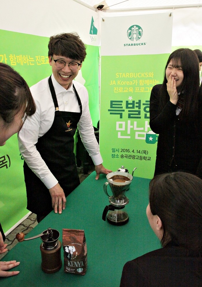 졸업 후 성공적 사회진출 돕기 실무적인 진로 설계 교육 구성 [화학신문 김영민 기자] ㈜스타벅스커피 코리아(대표 이석구)가 지난해에 이어 올해에도 교육기부 국제 NGO인 JA(Junior Achievement)와 함께 진행하는 청소년 진로 교육 프로그램을 전개한다.