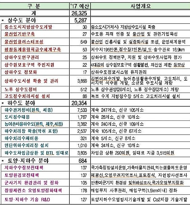 환경부는 2017년 상하수도 분야 주요 정책과제로 안전한 먹는물 공급, 하수도 위생·안전 서비스 개선, 물산업 육성, 지속가능한 토양관리 등을 중점 추진할 예정이다.