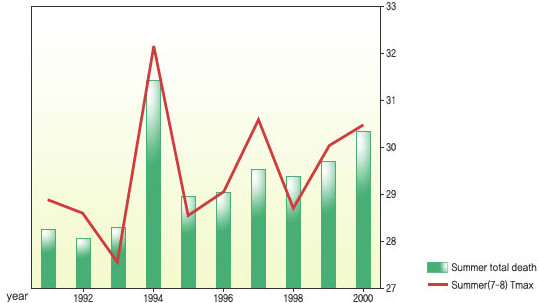 | ▲1991~2000 년간 서울지역 7-8월 평균 일최고기온과 사망자수 변화추이 |