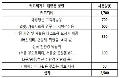 이를 위해 4월 14일 커피찌꺼기 자원을 재활용한 광화문역점에서 스타벅스커피 코리아 이석구 대표이사와 환경부 정연만 차관, 자원순환사회연대 김미화 사무총장이 참석해 커피찌꺼기 재활용 활성화 시범사업을 위한 업무 협약을 체결했다.