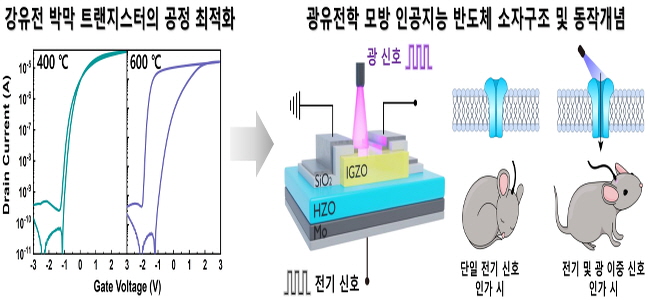 기존의 AI 반도체는 주로 전기 신호만을 이용해 학습하고 기억하는 방식으로, 데이터를 입력하고 처리하는 과정에서 에너지 소모가 크고 발열도 심해 정보 저장·연산 속도 저하의 주된 원인이 됐다. 이에 김형섭·김영훈 교수팀은 빛으로 신경 신호를 조절하는 광유전학에서 아이디어를 얻어 이를 반도체 소자에 적용하는 방법으로 문제를 해결했다.