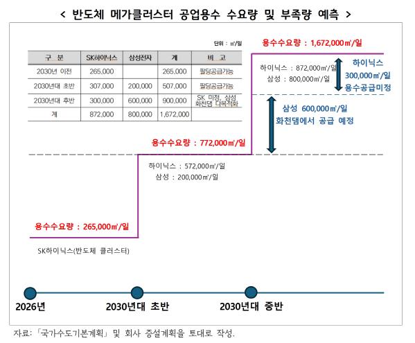 이에 정부는 발전 전용 댐인 화천댐을 다목적댐으로 전환하여 용수를 공급할 계획을 마련하고 있다. 그러나 화천댐의 다목적화는 유입 유량이 북한의 영향을 받기 때문에, 안정적인 용수 공급을 위해서는 북한과의 원활한 협력이 중요하나 정치적 상황을 고려할 때는 잠재적인 리스크가 존재한다. 또한 반도체산업의 경쟁력은 절대적 생산량으로, 정부의 규제완화 정책에 따라 증설계획을 포함시킬 경우 공업용수 부족량은 더욱 커질 전망이다.