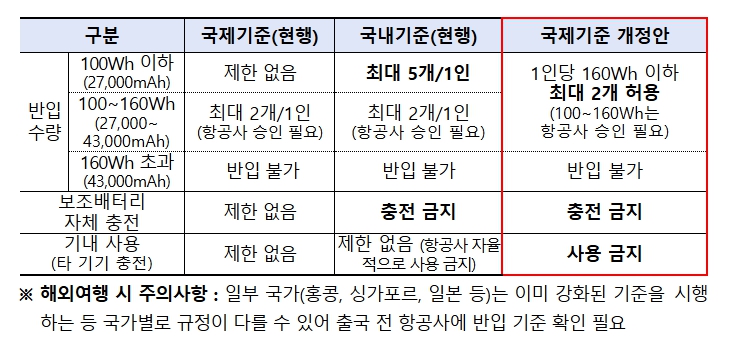 기존 국제기준에서는 일반인이 가장 많이 사용하는 100Wh(27,000mAh) 이하 보조배터리에 대한 반입 수량 제한이 없어, 국내 기준을 마련하여 1인당 5개까지 제한했으나, 앞으로는 신설된 국제기준에 따라 보조배터리(Power bank)는 1인당 최대 2개(160Wh/43,000mAh 이하)로 반입이 제한된다.