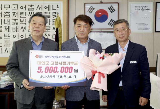 군에 따르면, 태안군 소원면 출신인 장효재 대표는 지난 16일 군청 군수실에서 가세로 군수 등이 참석한 가운데 기탁식을 갖고 태안군에 고향사랑기부금 연간 한도액인 500만 원을 전달했다.
