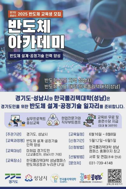 해당 아카데미는 성남시와 경기도, 한국폴리텍대학이 협력해 반도체 산업에 필요한 설계 및 공정기술 인재를 양성하고, 전문 교육부터 취업 연계까지 원스톱으로 지원하는 프로그램이다.