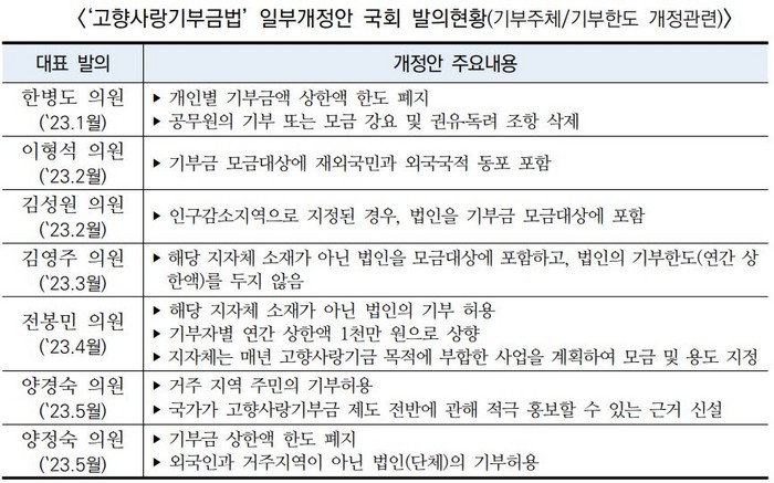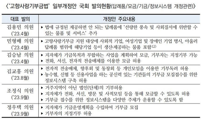 현안으로는 현재 연간 모금액 10조원 시대를 바라보고 있는 일본 고향납세와 비교할 때 우리의 고향사랑기부 제도는 개선이 필요한 요인들이 다수 포함돼 있으며 제도 활성화를 도모하기 위해 법률 개정안이 국회에 발의돼 있으나 준조세 변질가능성, 모금 과열경쟁 및 그에 따른 국민 불편 초래 등의 우려가 제기되는 상황이다.