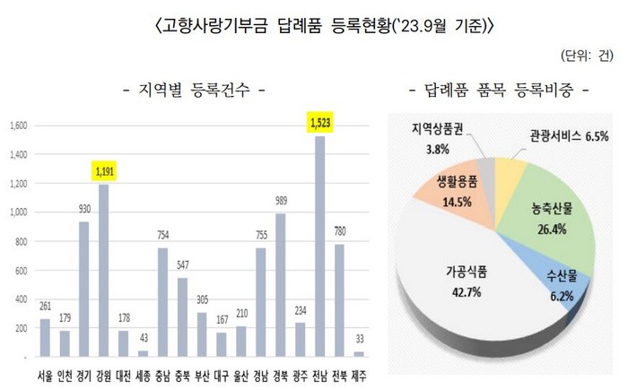 보고서에 따르면 올해 상반기 기준 전국 기초지자체 당 고향사랑기부금 평균 모금액은 1억 원이 채 되지 않아 저조한 수준이고, 답례품 경우 가공식품과 농축산물의 등록비중이 70%에 달하나 지자체에서 답례품비로 지출한 금액은 유가증권인 지역상품권이 절반이상(53%)을 차지하는 것으로 나타났다.