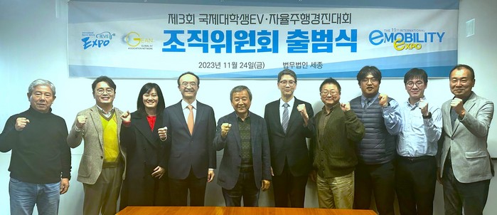 국제e-모빌리티엑스포와 세계e-모빌리티협의회는 지난 24일 서울 법무법인 세종에서'제3회 국제 대학생 EV 자율주행 경진대회' 조직위 출범식을 개최했다.