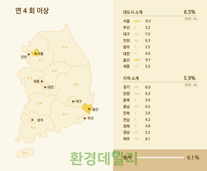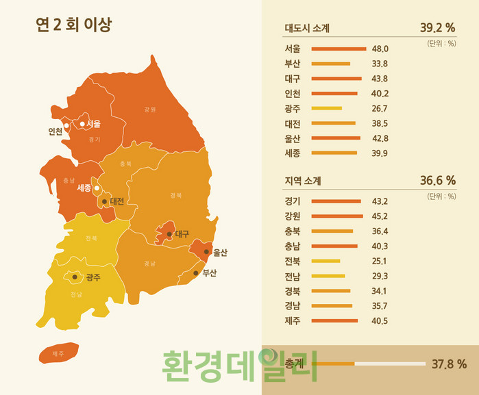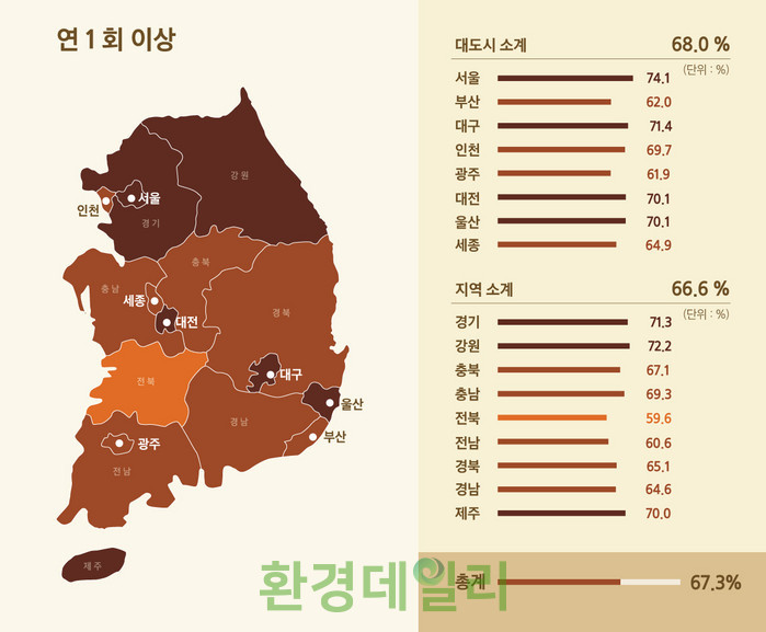 특히 도서 지역이 많고 농촌 가구가 많은 전라북도와 전라남도의 경우 연간 1회 이상 검사를 받은 사람의 비율이 각각 59.6%, 60.6%로 전체 17개 시도 중 가장 낮았다.