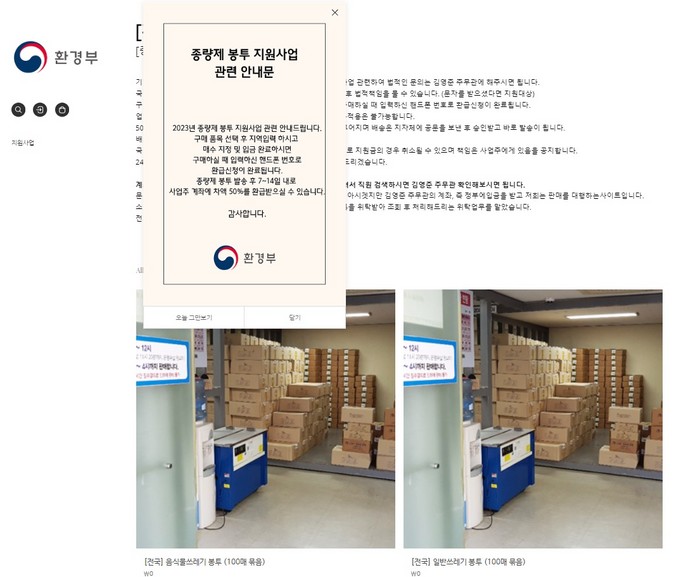 환경부는 '종량제 봉투 지원사업'을 실시하고 있지 않고, 소상공인 등에게 개별적으로 문자를 발송하지도 않다고 27일 밝혔다.