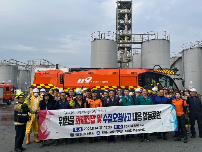 이번 훈련은 예기치 못한 화학물질 유출 및 화재 사고를 가정해 김해시, 김해서부소방서 2개 기관과 ㈜다우링에너지 관계자 50여명이 참여했다.