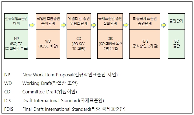 신규작업표준안 채택은 국제표준화 제정을 위한 첫 단계로, 국제표준은 작업반 초안(WD), 위원회안(CD), 국제표준안(DIS), 최종국제표준안(FDIS)의 절차를 거쳐 최종적으로 제정된다.