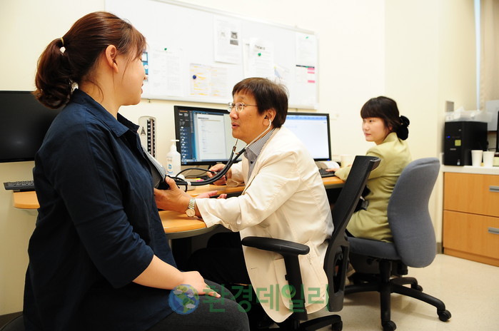 | ▲삼성서울병원은 심장질환 첫 방문클리닉을 개설해 매일 오전 환자상담과 진료를 진행하고 있다. 사진은 전은석 순환기내과 교수가 가슴 조임으로 심장질환이 의심돼 병원을 찾은 환자의 혈압을 확인 중이다. |