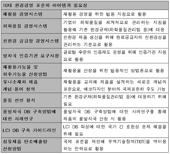 국제표준화할 10개 아이템은 코스피 200기업의 환경경영 활동과 국내외 환경 이슈 등을 분석해 도출했다.