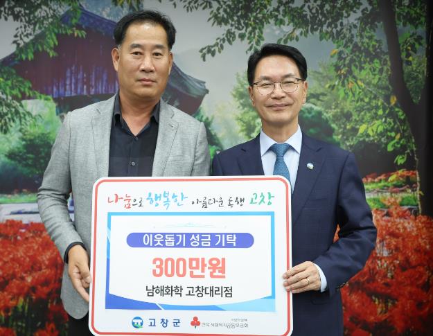 지난 8일 남해화학 고창대리점 김태경 대표가 “경제적으로 어려운 이웃들에게 작은 힘이 되었으면 좋겠다”며 300만원의 성금을 기탁했다.