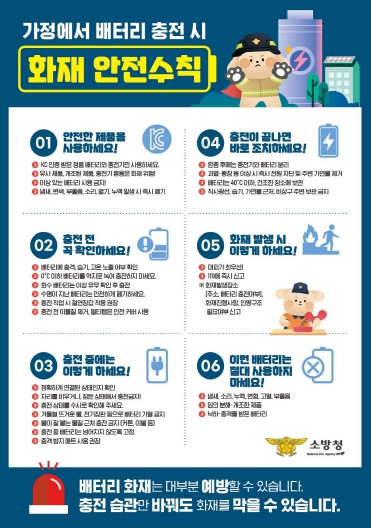 이에 홍성소방서는 군민들이 지켜야 할 생활 속 안전수칙을 제시했다. ▲정품 배터리와 충전기 사용 ▲충전 중 외출·수면 삼가기 ▲완충 후 전원 분리 ▲직사광선·고온 환경 피하기 ▲이상 징후 시 즉시 폐기 등이다. 아울러 전동킥보드·전기자전거는 환기가 되지 않는 곳을 피하고 소화설비가 갖춰진 안전한 장소에서 충전하는 것이 바람직하다.