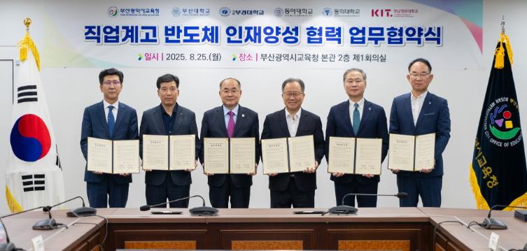 부산광역시교육청은 지난 25일 오후 2시 30분 교육청 회의실에서 부산대, 국립부경대, 동아대, 동의대, 경남정보대 등 5개 대학과 직업계고 반도체 인재 양성 체계 구축을 위한 업무협약을 체결했다고 밝혔다.