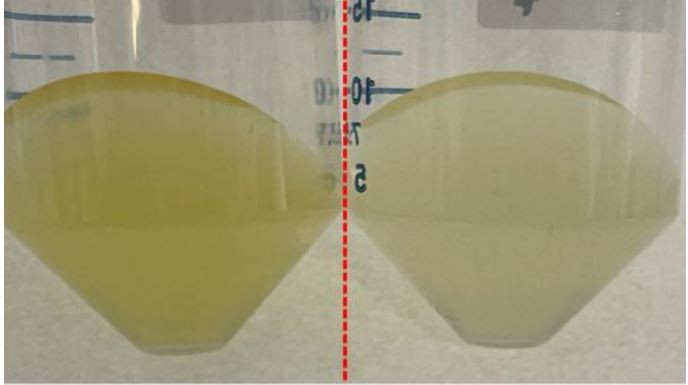 | ▲'플라보박테리움 체니애' N2820의 배양 (좌) 빛이 있는 조건 (우) 빛이 없는 조건 |