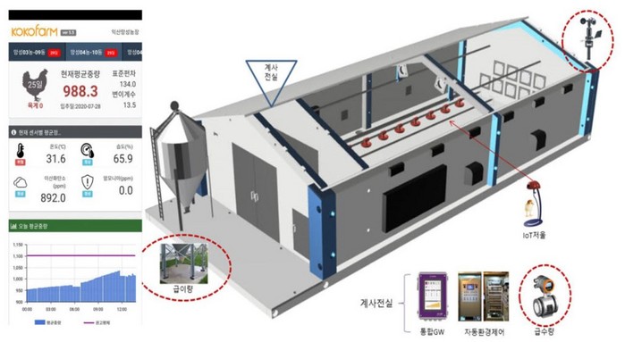 코코팜은 가금류 생체 및 환경 정보를 실시간 측정 장비가 핵심이다. 이 플랫폼은 급이량, 급수량, 온도·습도·이산화탄소·암모니아·풍속·풍향 등 외기환경 측정해 계사 환경으로 컨트롤한다.