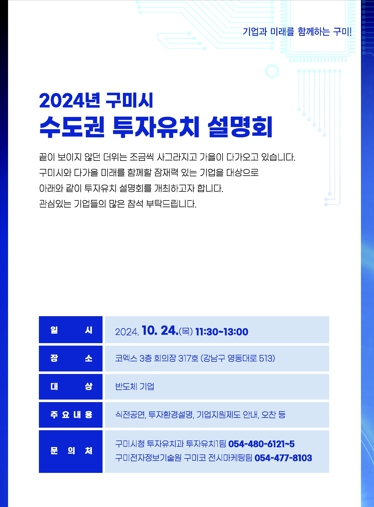 이번 설명회는 구미시가 보유한 탁월한 산업 경쟁력을 적극적으로 알리고, 수도권 기업들의 투자를 유치하기 위한 전략적 행보다. 특히, 구미 국가산업단지의 풍부한 경험과 구미 하이테크밸리의 혁신 인프라, 대구경북통합신공항의 시너지 효과 등을 집중적으로 홍보해 구미시의 투자 매력을 극대화할 예정이다.