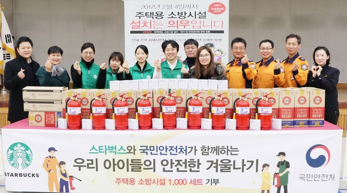 스타벅스는 28일 국민안전처와 함께 동작소방서에서 주택용 소방시설 전달식을 갖고, 소화기와 단독형 화재 감지기로 이루어진 주택용 소방시설 1000세트를 전달했다. 또한 동작 지역 내 설치 희망 가구를 동작소방서 소방관들과 함께 직접 방문, 소방시설 설치 및 소방안전교육도 함께 진행했다.