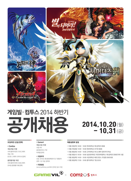 양사는 게임 제작(PD, 게임 기획, 클라이언트 프로그래머, 게임 서버 프로그래머, 2D·3D 그래픽 디자이너), 모바일 플랫폼(모바일 플랫폼 기획, 모바일 플랫폼 클라이언트·서버 프로그래머), 사업(사업 PM, 글로벌 서비스 PM, 마케팅) 등 전 부문에 걸쳐 신입(2015년 2월 졸업 예정자 및 기졸업자)과 경력(분야별 1년 이상 경력자)을 모집한다. 20일부터 31일 자정까지 공식 채용 홈페이지(recruit.withhive.com)를 통해 온라인 입사 지원이 이루어지며 서류 전형, 필기시험, 실무진 면접, 임원진 면접의 절차를 거쳐 최종 입사하게 된다. 23일부터는 대학 캠퍼스로 직접 찾아가는 ‘채용 설명회’도 마련, 회사 정보를 소개하고 각종 문의에 답하는 시간을 마련한다. 이번 공개 채용에 대한 자세한 내용은 공식 채용 홈페이지에서 확인할 수 있으며, 채용 담당자 이메일(recruit@gamevil.com / recruit@com2us.com)을 통해서도 문의할 수 있다.