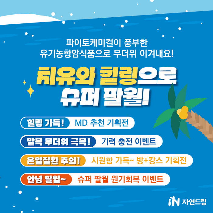 [화학신문 유혜리 기자]아이쿱자연드림(자연드림)이 9월 4일까지 막바지 무더위 여름과 가을맞이 원기회복 기획전 <힘을 내요 슈퍼팔(8)월> 이벤트가 진행중이다.