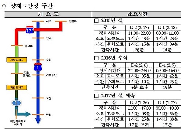 국토교통부는 2017년 설 명절 귀성 및 귀경을 하는 국민들이 설 연휴 기간 동안 편안하게 이동할 수 있도록 고속도로 주요 정체구간을 우회하는 주요 도로에 대한 교통예측 결과를 23일 발표했다.