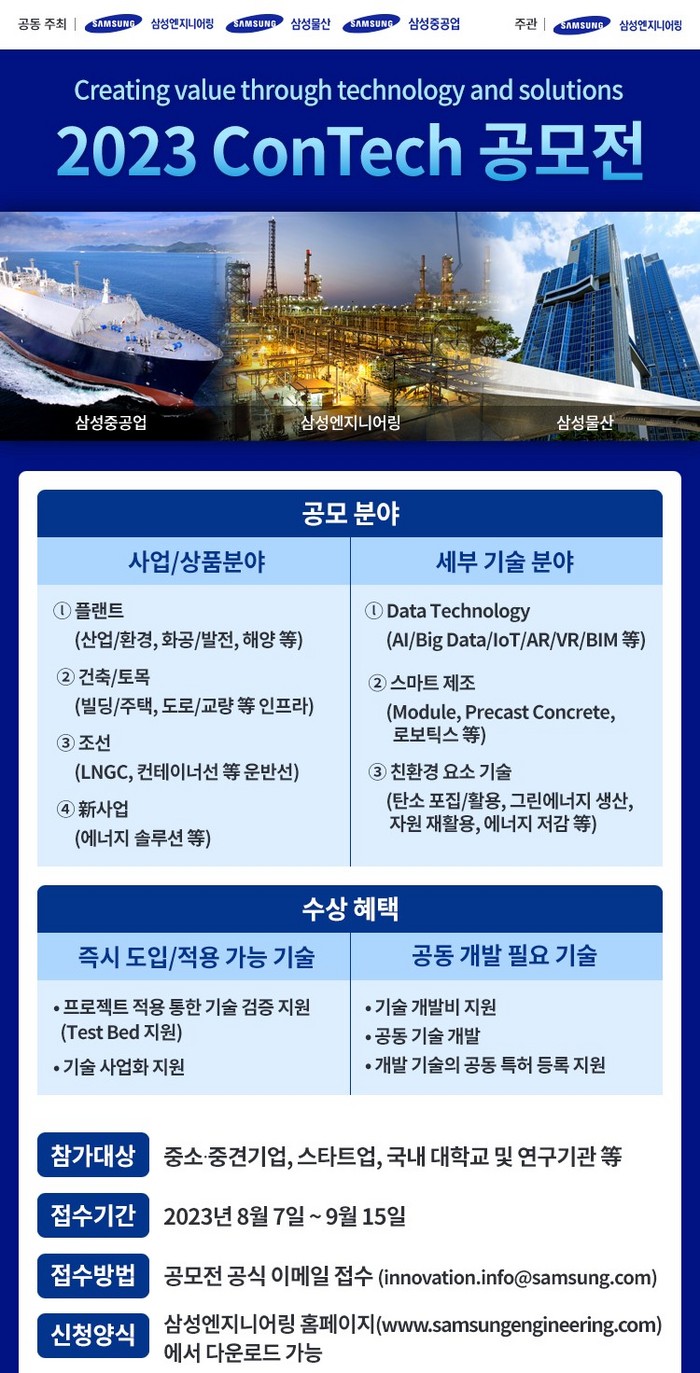 삼성엔지니어링, 삼성물산, 삼성중공업 등 삼성 EPC 3사는 EPC업에 적용 가능한 혁신 아이디어와 기술을 발굴하기 위해 '2023년 ConTech 공모전'을 개최한다고 3일 밝혔다.