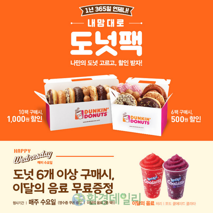 도넛 6개, 10개들 도넛팩 혜택, 무료 쿠폰 제공 해피수요일
