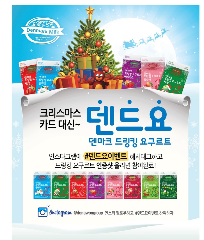 [화학신문 유혜리 기자]동원F&B(대표이사 김재옥)가 크리스마스 시즌을 맞아 '덴마크 드링킹 요구르트'크리스마스 에디션 8종을 출시하고 인스타그램(@dongwongroup)을 통해 경품행사를 진행한다.